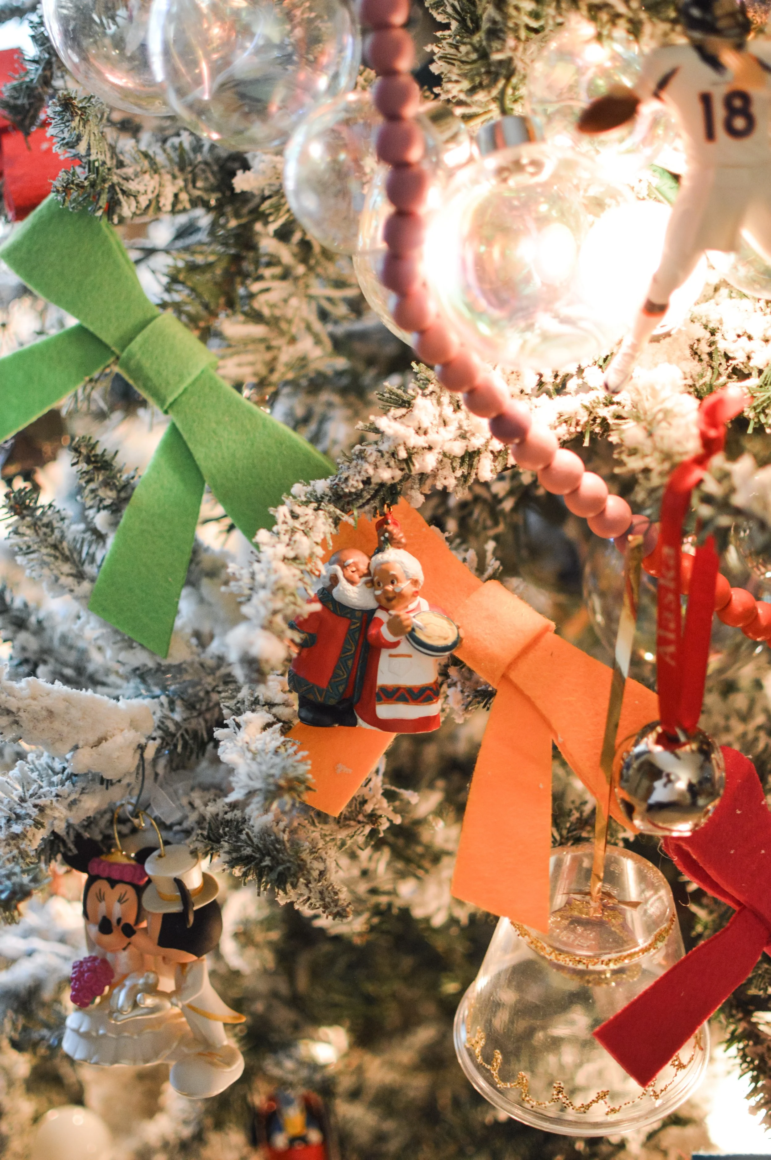 I always start my tree with ribbon. You can pay an arm and a leg for Christmas ribbon but I haven’t found that necessary for my vibes. I take two or three complimentary ribbons and twist them together with wire at the end to bind them together. Then I take that wired end and tuck it at the very top of the tree using the wire to tie it to a branch. From there I zig, zag, jump, hop, and skip down the tree. I don’t like my tree to look too much like a soft-serve ice cream cone. I don’t need the ribbon to swirl symmetrically or evenly. For me, the ribbon is just adding color, texture, and dimension to the tree. It also helps fill the tree so you don’t need one million ornaments.