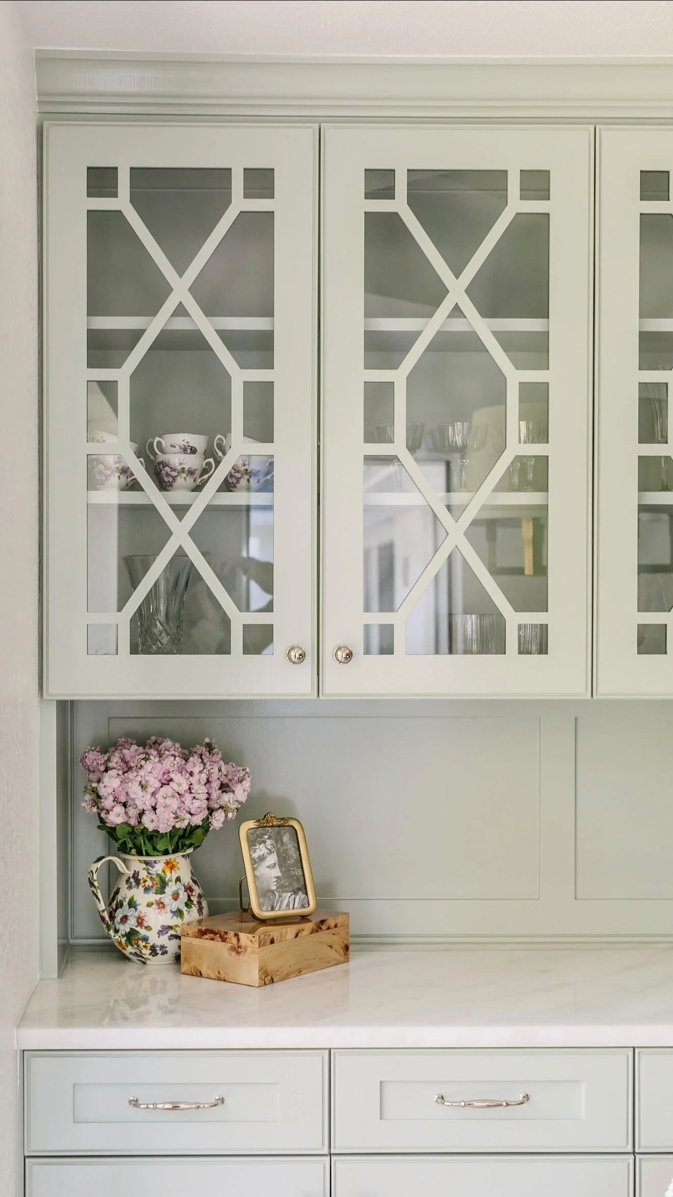 When comparing the formal rooms to the family rooms, you can see the fabrics we chose here are more playful and casual, but do still look like they’re in the same house. You’ll also notice some major differences in how the two spaces are styled! In the family room we gave them new bookshelves for cheer photos, trophies, pictures with the president (literally, not even joking)…the stuff of life, where the formal, is just that: formal! At Lambert Home, we really don’t think family photos are appropriate for entry or public spaces in the home. No offense to the FedEx man, but he doesn’t need to see the baby in her swimsuit or the family at the lake house. That’s only for guests who are invited farther into the home!